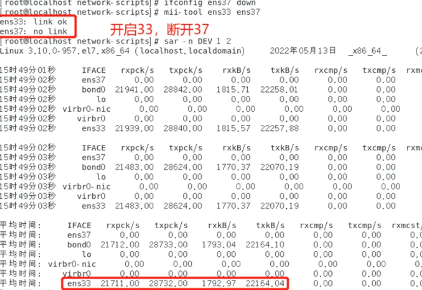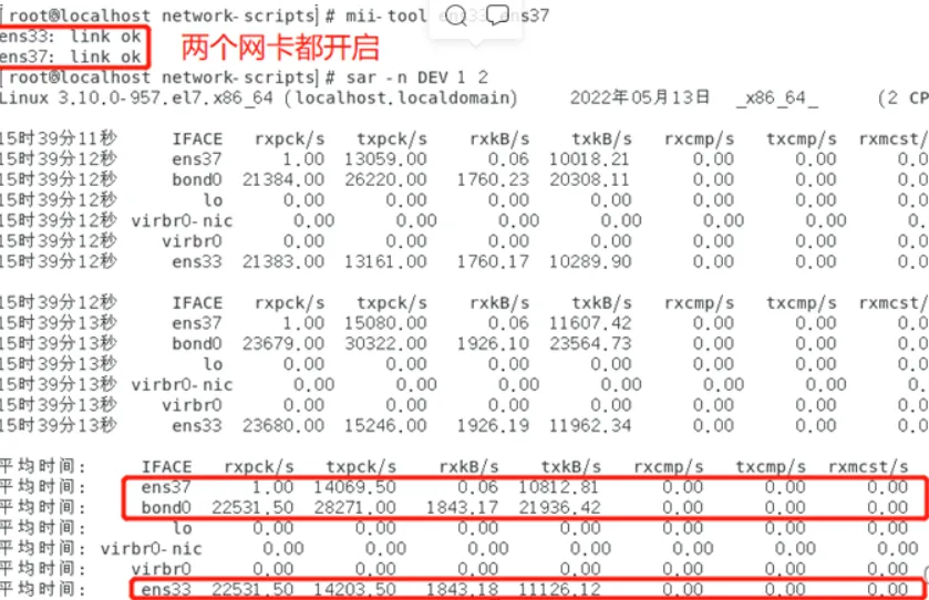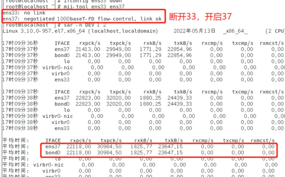 由上述实验案例可以验证bond是将多块物理网卡虚拟为一块逻辑网卡,可以通过主从的配置来讲进行网络的运行维护。