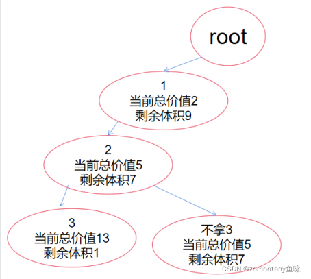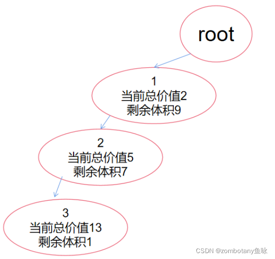 因此,先装入第一个物品,此时体积足够装入第二个物品。装完第二个物品后,还能在装第三个物品。以深度优先的顺序,此时访问到的解空间树的结点如图所示: