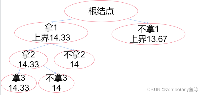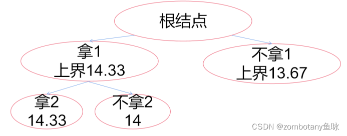此时大根堆堆顶为(“拿1,上界14.33”)。对其进行扩展,以是否拿2作为区分的依据。拿2时,价值上界为14.33。不拿2时,价值上界为14。将这两个结点都加入堆(优先队列)。