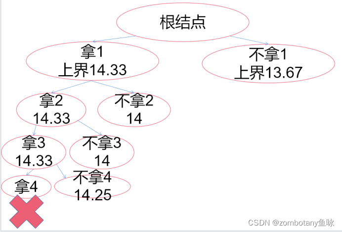 此时大根堆堆顶为“拿3,上界14.33”。对其进行扩展,以是否拿4作为区分依据。拿4时,背包此时体积超过上限,不可行。不拿4时,价值上界为14.25。将可行的右结点加入堆(优先队列)。