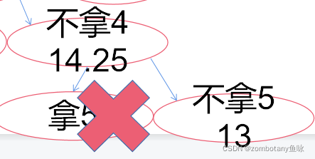 此时大根堆堆顶为“不拿4,上界14.25”。对其进行扩展,以是否拿5作为区分依据。拿5时,背包此时体积超过上限,不可行。不拿5时,价值上界为13。将可行的右结点加入堆(优先队列)。