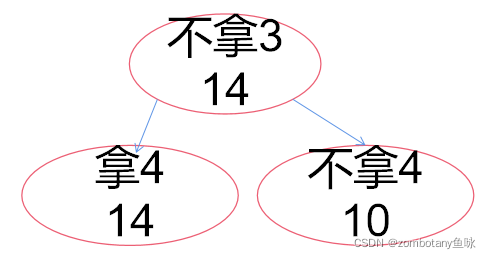 此时大根堆堆顶为“不拿3,上界14”。对其进行扩展,以是否拿4作为区分依据。拿4时,价值上界为14。不拿4时,价值上界为10。这两个结点都可行,都加入堆(优先队列)。