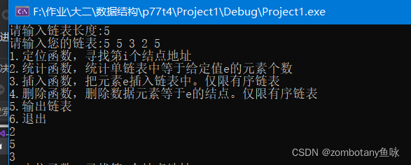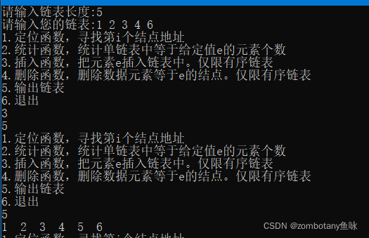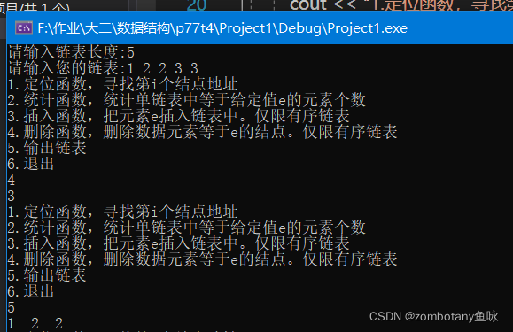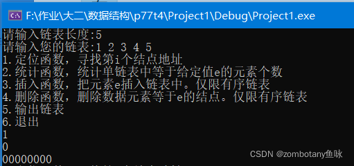 #include<iostream> #include"linklist.h" #include"node.h" #define SUCCESS 1 #define ERROR 0 using namespace std; typedef int Status; int main() { int n,a[100]; cout << "请输入链表长度:"; cin >> n; int num; cout << "请输入您的链表:"; for (int i = 0; i < n; i++) cin >> a[i]; linklist<int> link1(a, n); node<int>* p = NULL; int func; do { cout << "1.定位函数,寻找第i个结点地址" << endl; cout << "2.统计函数,统计单链表中等于给定值e的元素个数" << endl; cout << "3.插入函数,把元素e插入链表中。仅限有序链表" << endl; cout << "4.删除函数,删除数据元素等于e的结点。仅限有序链表" << endl; cout << "5.输出链表" << endl; cout << "6.退出" << endl; cin >> func; switch (func) { case 1: cin >> num; p = link1.seek(num); cout << p << endl; break; case 2: cin >> num; cout << link1.counting(num)<<endl; break; case 3: cin >> num; link1.insert(num); break; case 4: cin >> num; link1.deleteVal(num); break; case 5: link1.show(); break; case 6:break; default:cout << "输入错误!"<<endl; break; } } while (func!=6); cout << "运行结束"; }