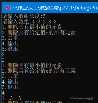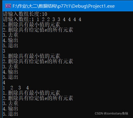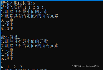 #include<iostream> #include"seqlist.h" #define SUCCESS 1 #define DEFAULT_SIZE 100 #define ERROR 0 typedef int status; using namespace std; int main() { cout << "请输入数组长度:"; int len; cin >> len; int a[100]; cout << "请输入数组:"; for (int i = 0; i < len; i++) cin >> a[i]; seqlist<int> seq1(a, len, DEFAULT_SIZE); int func; int num; do { cout << "1.删除具有最小值的元素" << endl; cout << "2.删除具有给定值e的所有元素" << endl; cout << "3.去重" << endl; cout << "4.输出" << endl; cout << "5.退出" << endl; cin >> func; switch (func) { case 1: cout<<"最小值是"<<seq1.findmin()<<endl; break; case 2: cin >> num; seq1.deleteE(num); break; case 3: seq1.deleteRepeated(); break; case 4: seq1.show(); break; case 5:break; default:cout << "输入错误!" << endl; break; } } while (func != 5); }
