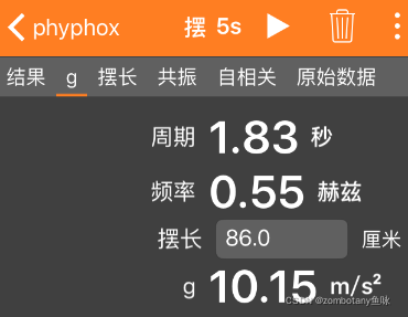 4.从phyphox上读取经过计算的数据g,并将其与在1和3步骤中测得的数据t与l通过实验原理中提供的公式进行比对。