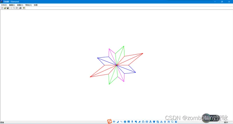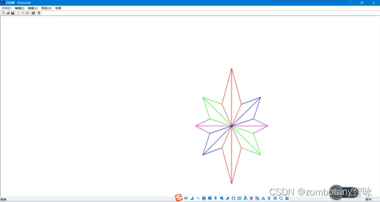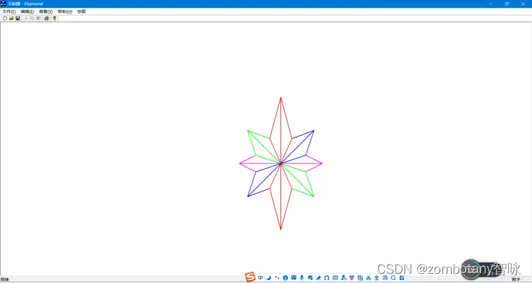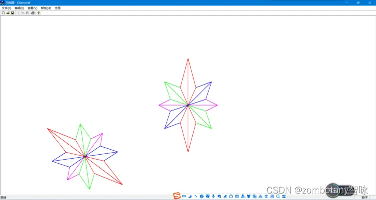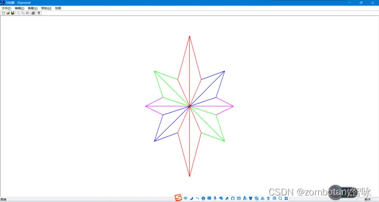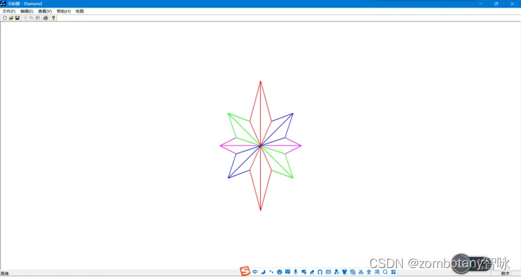 void drawPolaris(CDC* pDC, POINT vertex[17]){ CPen newPen, * oldPen; newPen.CreatePen(PS_SOLID, 2, RGB(255, 0, 255)); oldPen = pDC->SelectObject(&newPen); POINT shape1[3] = { vertex[0],vertex[1],vertex[2] }; pDC->Polygon(shape1, 3); POINT shape2[3] = { vertex[0],vertex[1],vertex[16] }; pDC->Polygon(shape2, 3); POINT shape3[3] = { vertex[0],vertex[9],vertex[8] }; pDC->Polygon(shape3, 3); POINT shape4[3] = { vertex[0],vertex[9],vertex[10] }; pDC->Polygon(shape4, 3); newPen.DeleteObject(); newPen.CreatePen(PS_SOLID, 2, RGB(0, 255, 0)); oldPen = pDC->SelectObject(&newPen); POINT shape5[3] = { vertex[0],vertex[2],vertex[3] }; pDC->Polygon(shape5, 3); POINT shape6[3] = { vertex[0],vertex[3],vertex[4] }; pDC->Polygon(shape6, 3); POINT shape7[3] = { vertex[0],vertex[11],vertex[10] }; pDC->Polygon(shape7, 3); POINT shape8[3] = { vertex[0],vertex[11],vertex[12] }; pDC->Polygon(shape8, 3); newPen.DeleteObject(); newPen.CreatePen(PS_SOLID, 2, RGB(0, 0, 255)); oldPen = pDC->SelectObject(&newPen); POINT shape9[3] = { vertex[0],vertex[14],vertex[15] }; pDC->Polygon(shape9, 3); POINT shape10[3] = { vertex[0],vertex[15],vertex[16] }; pDC->Polygon(shape10, 3); POINT shape11[3] = { vertex[0],vertex[6],vertex[7] }; pDC->Polygon(shape11, 3); POINT shape12[3] = { vertex[0],vertex[7],vertex[8] }; pDC->Polygon(shape12, 3); newPen.DeleteObject(); newPen.CreatePen(PS_SOLID, 2, RGB(255, 0, 0)); oldPen = pDC->SelectObject(&newPen); POINT shape13[3] = { vertex[0],vertex[4],vertex[5] }; pDC->Polygon(shape13, 3); POINT shape14[3] = { vertex[0],vertex[6],vertex[5] }; pDC->Polygon(shape14, 3); POINT shape15[3] = { vertex[0],vertex[12],vertex[13] }; pDC->Polygon(shape15, 3); POINT shape16[3] = { vertex[0],vertex[14],vertex[13] }; pDC->Polygon(shape16, 3); } //北极星 void CDiamondView::Polaris() { const double PI = 3.14159; InvalidateRgn(NULL); UpdateWindow(); CDC* pDC = GetDC(); POINT vertex[17] = { {MaxX() / 2, MaxY() / 2}, {MaxX() / 2 + 150,MaxY() / 2}, {MaxX() / 2 + 90, MaxY() / 2 + 30}, {MaxX() / 2 + 120,MaxY() / 2 + 120}, {MaxX() / 2 + 40, MaxY() / 2 + 90}, {MaxX() / 2, MaxY() / 2 + 240}, {MaxX() / 2 - 40, MaxY() / 2 + 90}, {MaxX() / 2 - 120,MaxY() / 2 + 120}, {MaxX() / 2 - 90, MaxY() / 2 + 30}, {MaxX() / 2 - 150,MaxY() / 2}, {MaxX() / 2 - 90, MaxY() / 2 - 30}, {MaxX() / 2 - 120,MaxY() / 2 - 120}, {MaxX() / 2 - 40, MaxY() / 2 - 90}, {MaxX() / 2 , MaxY() / 2 - 240}, {MaxX() / 2 + 40, MaxY() / 2 - 90}, {MaxX() / 2 + 120,MaxY() / 2 - 120}, {MaxX() / 2 + 90, MaxY() / 2 - 30} }; POINT initVertex[17]={}; for (int i = 0; i < 17; i++) initVertex[i] = vertex[i]; drawPolaris(pDC, vertex); Sleep(2000); InvalidateRect(NULL); UpdateWindow(); for (double k = 1; k <=1.3; k += 0.01) { for (int i = 0; i < 17; i++) { vertex[i].x = initVertex[i].x * k; vertex[i].y = initVertex[i].y * k; } drawPolaris(pDC, vertex); Sleep(50); InvalidateRect(NULL); UpdateWindow(); } for (double k = 1.3; k >=0.1; k -= 0.01) { for (int i = 0; i < 17; i++) { vertex[i].x = initVertex[i].x * k; vertex[i].y = initVertex[i].y * k; } drawPolaris(pDC, vertex); Sleep(50); InvalidateRect(NULL); UpdateWindow(); } for (double k = 0.1; k <= 1.5; k += 0.01) { int xp = MaxX() / 2; int yp = MaxY() / 2; for (int i = 0; i < 17; i++) { vertex[i].x = k * initVertex[i].x + (1 - k) * xp; vertex[i].y = k * initVertex[i].y + (1 - k)* yp; } drawPolaris(pDC, vertex); Sleep(50); InvalidateRect(NULL); UpdateWindow(); } for (int dx = 0; dx < 100; dx++) { for (int i = 0; i < 17; i++) { vertex[i].x = initVertex[i].x + dx; vertex[i].y = initVertex[i].y + dx; } drawPolaris(pDC, vertex); Sleep(50); InvalidateRect(NULL); UpdateWindow(); } for (double theta = 0; theta <=2* PI; theta += 0.05) { int xp = MaxX() / 2; int yp = MaxY() / 2; for (int i = 0; i < 17; i++) { vertex[i].x = initVertex[i].x * cos(theta) - initVertex[i].y * sin(theta) + xp - xp * cos(theta) + yp * sin(theta); vertex[i].y = initVertex[i].x * sin(theta) + initVertex[i].y * cos(theta) - xp * sin(theta) + yp - yp * cos(theta); } drawPolaris(pDC, vertex); Sleep(50); InvalidateRect(NULL); UpdateWindow(); } double A = -2, B = 1, C = 800; double alpha = atan(( - 1.0 * A) / (1.0 * B)); for (int i = 0; i < 17; i++) { vertex[i].x = max(initVertex[i].x * cos(2 * alpha) + initVertex[i].y * sin(2 * alpha) + (cos(2 * alpha) - 1) * C / A,0); vertex[i].y = max(initVertex[i].x * sin(2 * alpha) + initVertex[i].y * -cos(2 * alpha) + sin(2 * alpha) * C / A,0); } drawPolaris(pDC, initVertex); drawPolaris(pDC, vertex); }