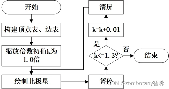本实验中使用的算法主要涉及数学处理。数学处理见第三章。程序与流程上的处理较为简单,以图3的流程为例。图3的流程为以窗口原点为原点进行的北极星进行放大操作流程。