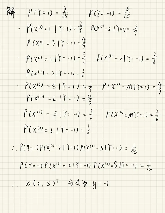 2. 试由下表的训练数据学习一个朴素贝叶斯分类器并确定 x=(2,S)T