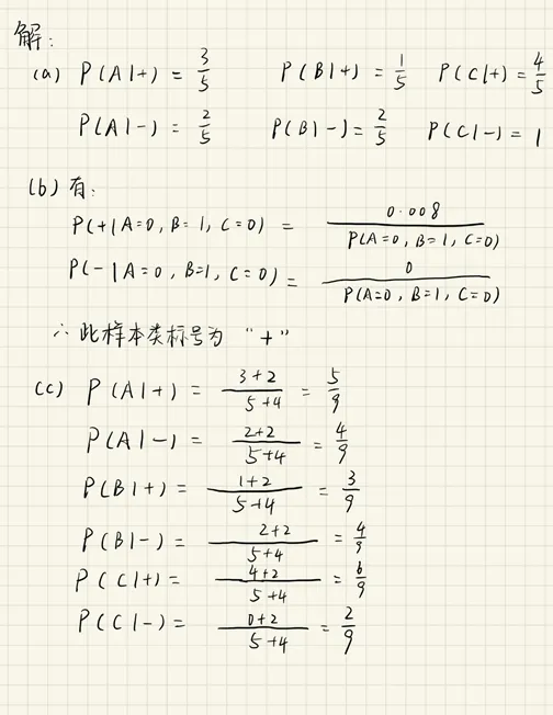 (a) 估计条件概率P(A|+),P(B|+),P(C|+),P(A|-),P(B|-)和P(C|-).