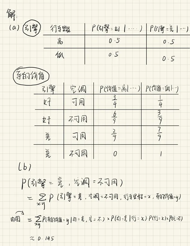 (b) 使用贝叶斯网络计算P(引擎=差,空调=不可用)。