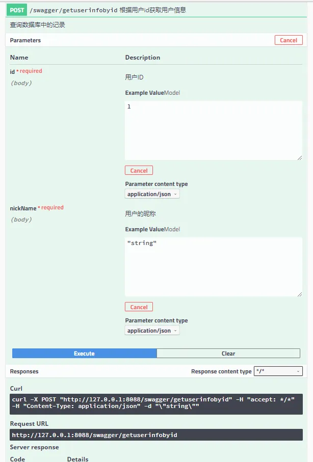 @ApiImplicitParams({ @ApiImplicitParam(name = "nickName",value = "用户的昵称",paramType = "query",dataType = "String",required = true), @ApiImplicitParam(name = "id",value = "用户的ID",paramType = "query",dataType = "Integer",required = true) }) public String getUserInfoByNickName(String nickName, Integer id) { return "1234"; }