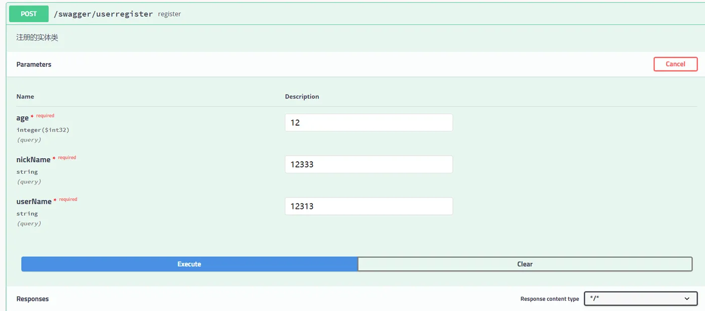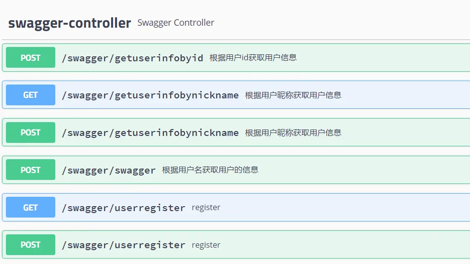 @RestController @RequestMapping("/swagger") @Api(value = "swagger2的demo例子") public class SwaggerController { @RequestMapping("/swagger") @ResponseBody @ApiOperation(value = "根据用户名获取用户的信息",notes = "查询数据库中的记录",httpMethod = "POST",response = String.class) @ApiImplicitParam(name = "userName",value = "用户名",required = true,dataType = "String",paramType = "query") public String getUserInfo(String userName) { return "1234"; } @RequestMapping(value = "/getuserinfobynickname",method = {RequestMethod.GET,RequestMethod.POST}) @ResponseBody @ApiOperation(value = "根据用户昵称获取用户信息",notes = "查询数据库中的记录") @ApiImplicitParams({ @ApiImplicitParam(name = "nickName",value = "用户的昵称",paramType = "query",dataType = "String",required = true), @ApiImplicitParam(name = "id",value = "用户的ID",paramType = "query",dataType = "Integer",required = true) }) public String getUserInfoByNickName(String nickName, Integer id) { return "1234"; } @RequestMapping(value = "/getuserinfobyid",method = {RequestMethod.GET,RequestMethod.POST}) @ResponseBody @ApiOperation(value = "根据用户id获取用户信息",notes = "查询数据库中的记录",httpMethod = "POST") public String getUserInfoById(@ApiParam(name = "nickName",value = "用户的昵称",required = true,defaultValue = "123-默认值") String nickName,@ApiParam(name = "id",value = "用户ID",required = true) Integer id) { return "1234"; } @RequestMapping(value = "/userregister",method = {RequestMethod.GET,RequestMethod.POST}) @ResponseBody @ApiOperation(value = "register",notes = "注册的实体类") public Register userRegister(Register register) { return register; } }