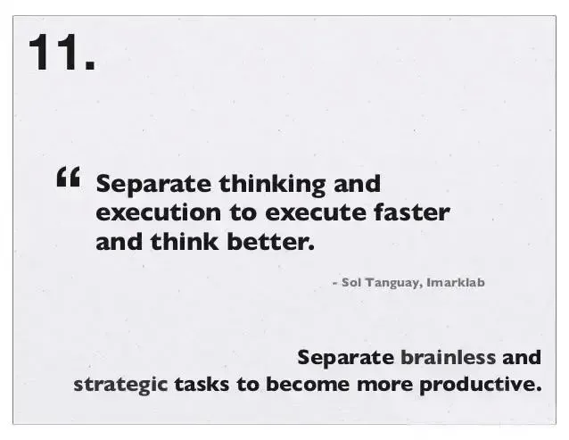 18、必须清楚白天必须完成的那件事,是什么。“Only ever work on the thing that will have the biggest impact” 只去做那件有着最大影响的事情。—— Jason Cohen