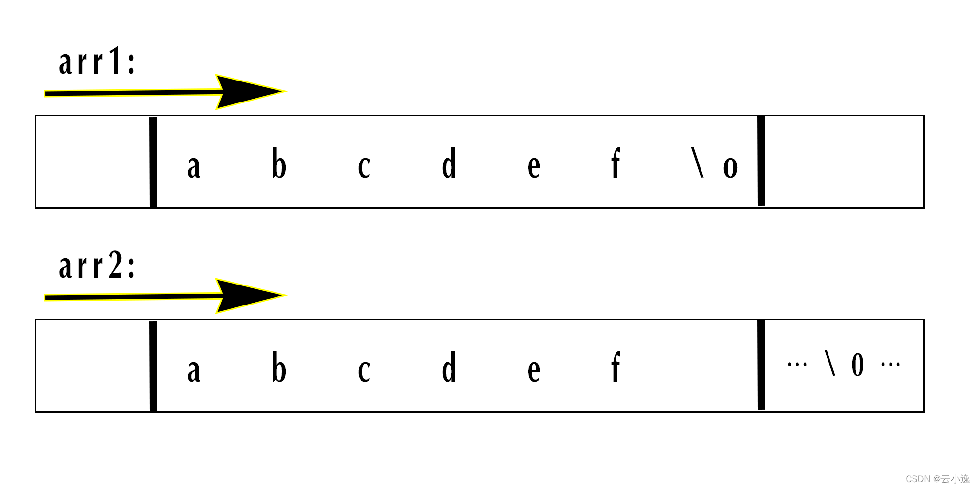 注:第三行出现:arr1的长度 :36和第五行出现:arr1的内容 :love烫烫烫烫烫烫烫烫烫烫烫烫烫烫love的原因是strlen和printf函数均是遇到'\0'才停住,由于定义字符数组时没有加上'\0'导致'\0'位置未知,故出现此种情况,用我以前的一篇博客(初识C语言(1))做的图供大家理解: