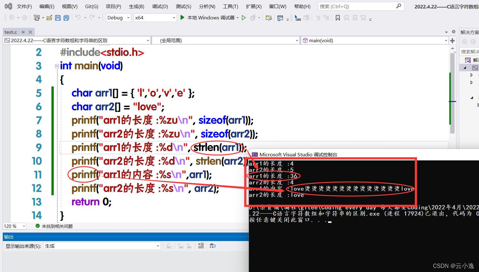 #include<stdio.h> int main(void) { char arr1[] = { 'l','o','v','e' }; char arr2[] = "love"; printf("arr1的长度 :%zu\n", sizeof(arr1)); printf("arr2的长度 :%zu\n", sizeof(arr2)); printf("arr1的长度 :%d\n", strlen(arr1)); printf("arr2的长度 :%d\n", strlen(arr2)); printf("arr1的内容 :%s\n",arr1); printf("arr2的长度 :%s\n", arr2); return 0; }