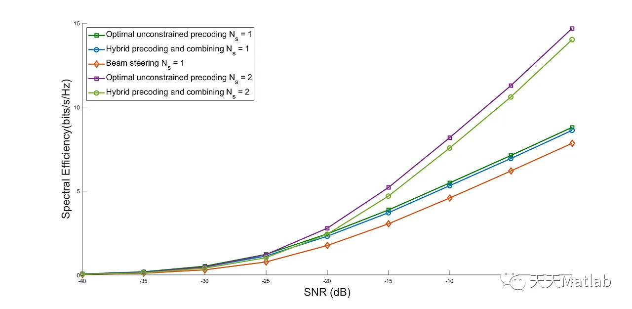 legend([l1 l2 l3 l4 l5],'Optimal unconstrained precoding N_s = 1','Hybrid precoding and combining N_s = 1','Beam steering N_s = 1','Optimal unconstrained precoding N_s = 2','Hybrid precoding and combining N_s = 2','Location','northwest','FontSize',15);