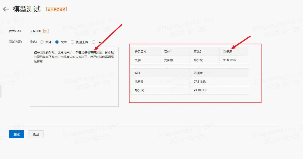 抽取文本中的实体及对应的关系。例如人名与生日,机构与成立时间等,本平台支持定制基于用户自建关系体系的关系抽取模型。
