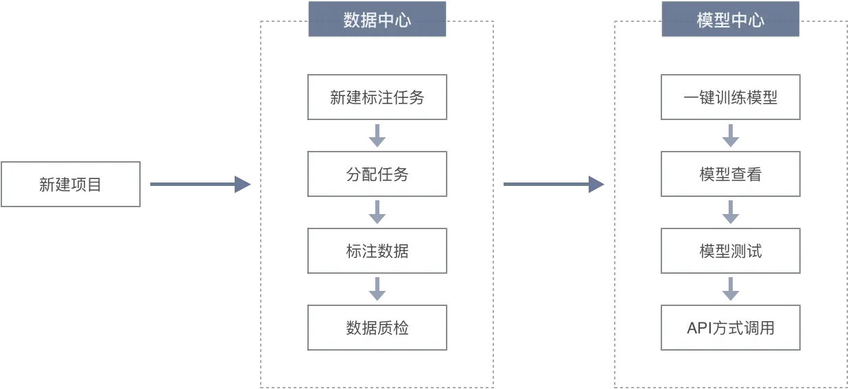NLP自学习平台的基本使用流程如下图所示,全程可交互操作,无需工程与算法背景,预计500份以上的标注数据时,模型准确率可以达到85%以上