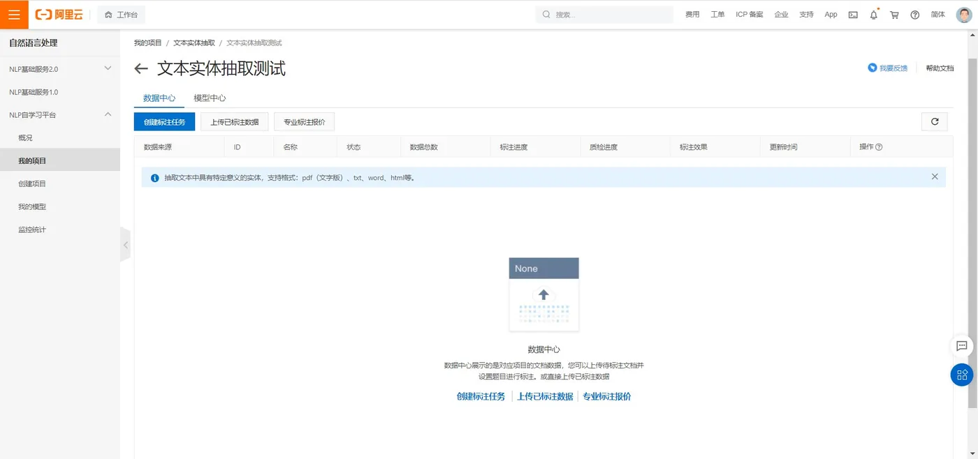 创建并管理自己的项目,目前您可以创建十三种项目类型:1、文本实体抽取;2、文本分类;3、关键短语抽取;4、情感分析;5、文本关系抽取;6、短文本匹配;7、商品评价解析;8、简历抽取;9、双句文本分类;10、招中标信息抽取;11、合同要素抽取;12、合同抽取;13、对话文本分类。