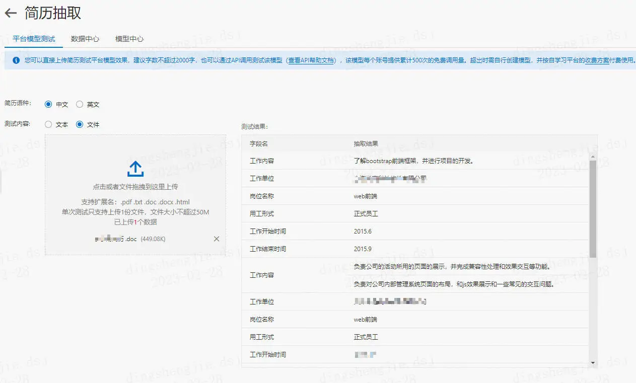 根据平台模型限制本人主要进行了基础算法、行业场景应用模型两类:简历抽取、关系抽取、文本分类进行测试。