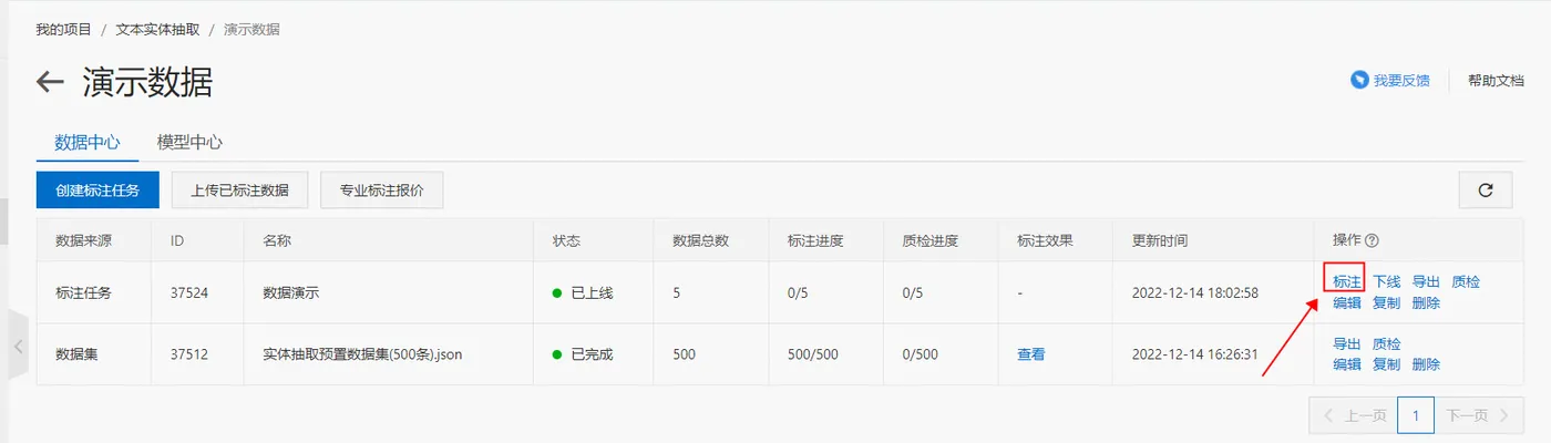 完成标注任务的创建后,您可以在数据中心中,点击标注进入标注中心,进行文档的标注,每篇文档仅会被标注一次。