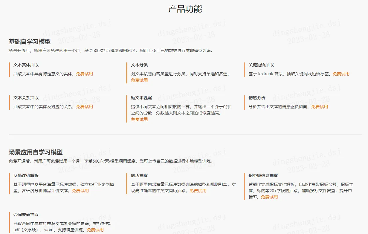 NLP自学习平台支持文本实体抽取、文本分类、关键短语抽取、情感分析、关系抽取、商品评价解析、简历抽取和合同要素抽取等NLP定制化算法能力,用户无需拥有丰富的算法背景,仅需标注或上传适量文档数据,即可通过平台快速创建算法模型并使用。