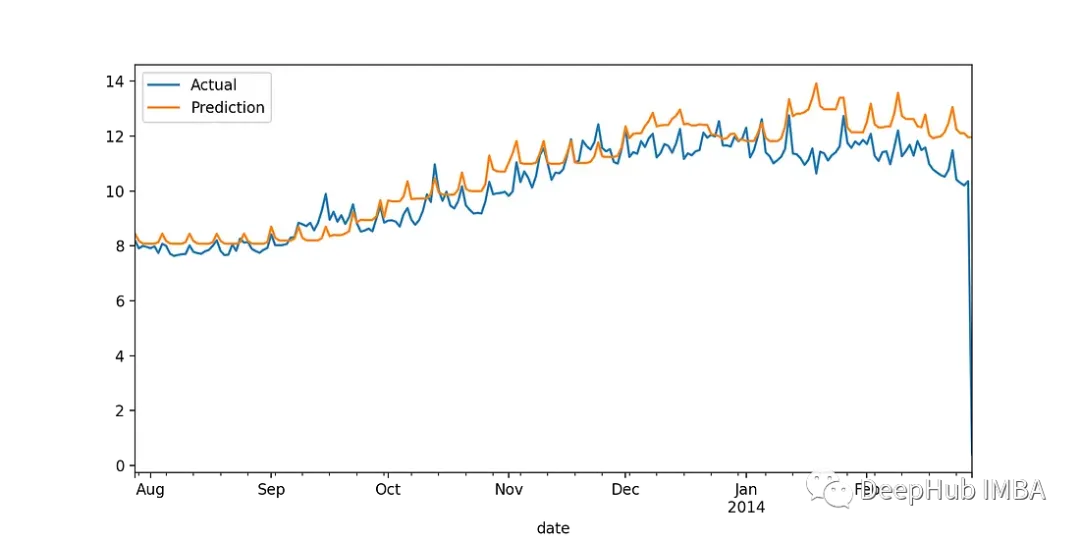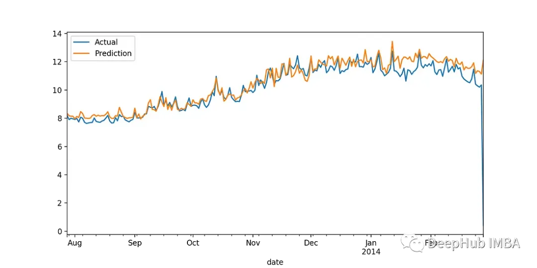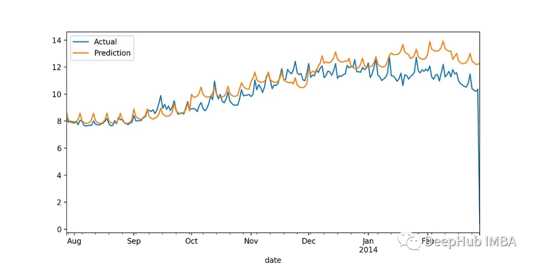 为了评估测试集上的最佳估计量,我们将计算:平均绝对误差(MAE)、均方误差(MSE)和平均绝对百分比误差(MAPE)。因为每个指标都提供了训练模型实际性能的不同视角。我们还将绘制一个折线图,以更好地可视化模型的性能。