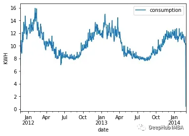 “LCLid”是标识每个家庭的唯一字符串,“Date”就是我们的时间索引,“KWH”是在该日期花费的总千瓦时数,没有任何缺失值。由于我们想要以一般方式而不是以家庭为单位来预测耗电量,所以我们需要将结果按日期分组并平均千瓦时。
