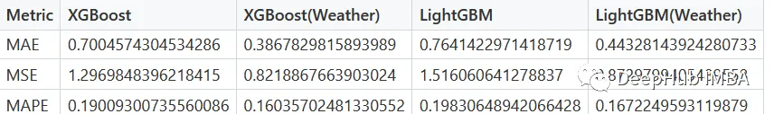 我们看到:天气数据大大提高了两个模型的性能。特别是在XGBoost场景中,MAE减少了近44%,而MAPE从19%减少到16%。对于LightGBM, MAE下降了42%,MAPE从19.8%下降到16.7%。