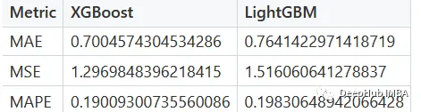 从图上可以看到,XGBoost可以更准确地预测冬季的能源消耗,但为了量化和比较性能,我们计算误差指标。通过查看下面的表,可以很明显地看出XGBoost在所有情况下都优于LightGBM。
