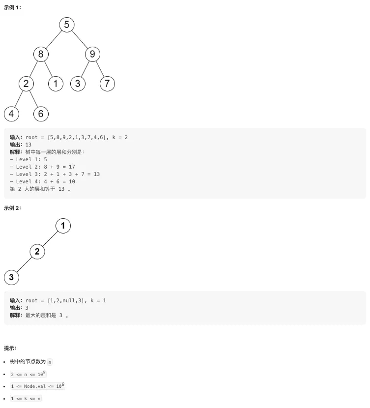 返回树中第 k 大的层和(不一定不同)。如果树少于 k 层,则返回 -1 。