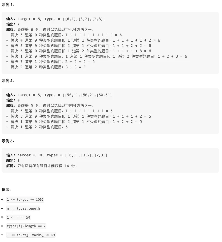 返回你在考试中恰好得到 target 分的方法数。由于答案可能很大,结果需要对 109 +7 取余。