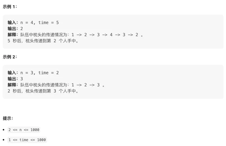 最初,排在队首的第一个人拿着一个枕头。每秒钟,拿着枕头的人会将枕头传递给队伍中的下一个人。一旦枕头到达队首或队尾,传递方向就会改变,队伍会继续沿相反方向传递枕头。