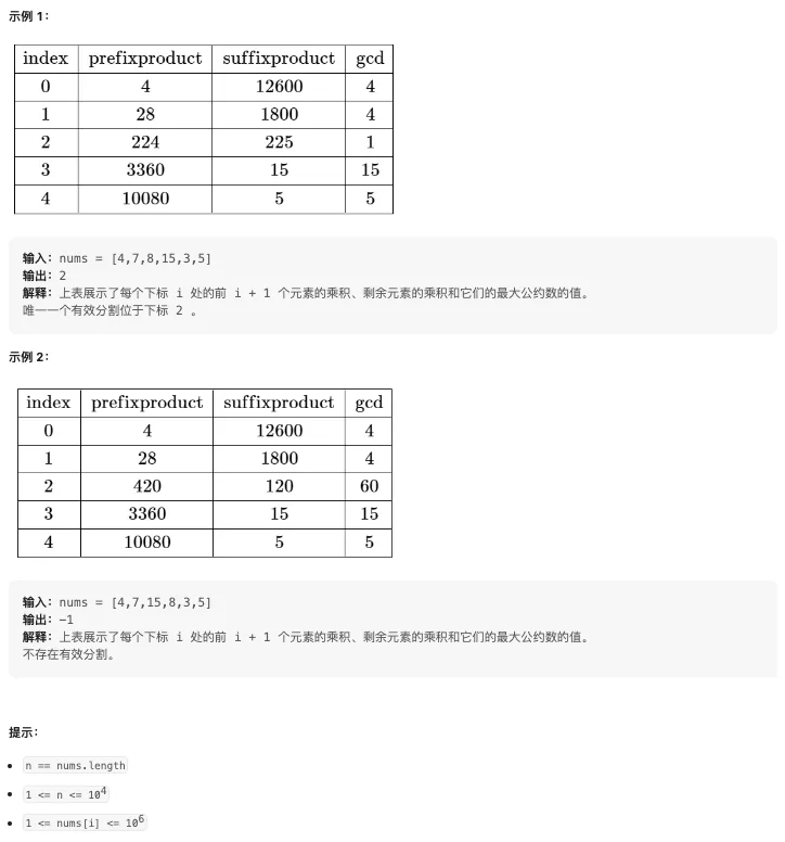 如果在下标 i 处 分割 数组,其中 0 <= i <= n - 2 ,使前 i + 1 个元素的乘积和剩余元素的乘积互质,则认为该分割 有效 。