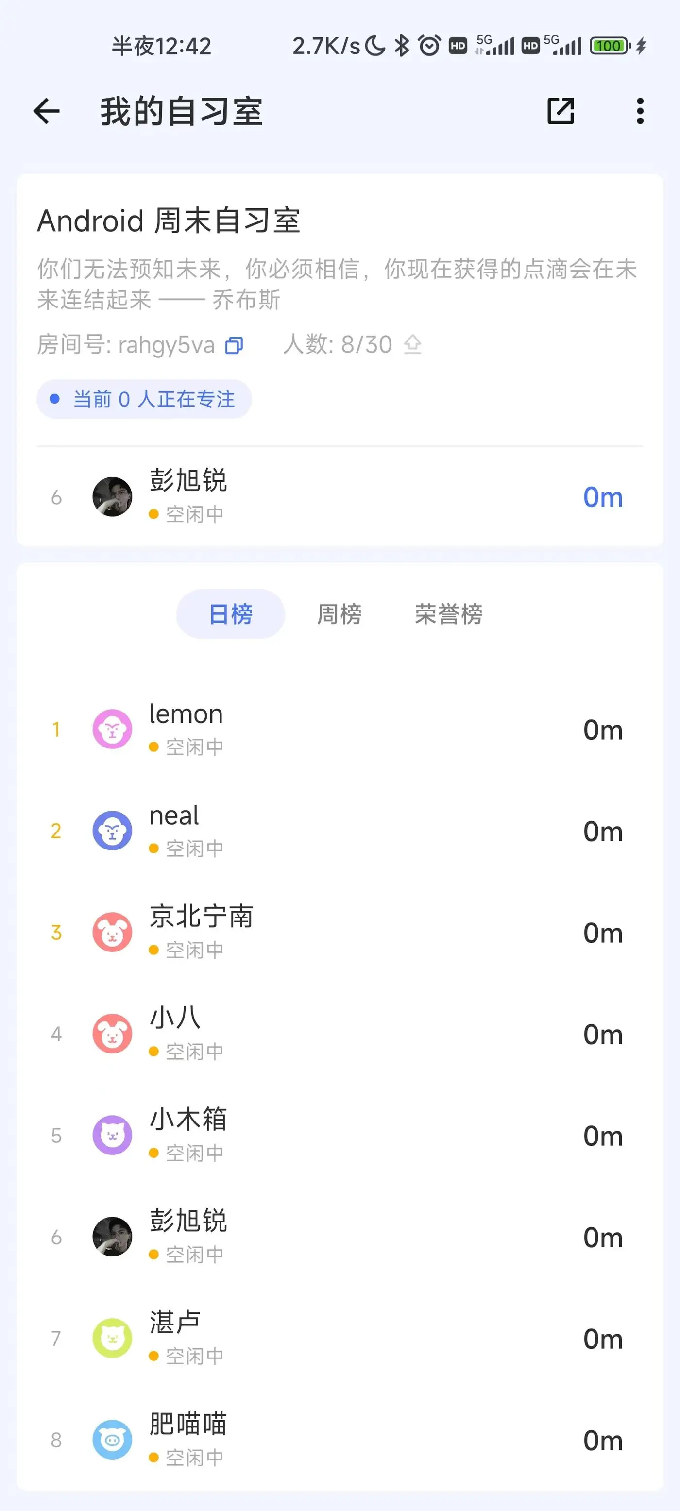 最近,我发现滴答清单不仅能够自己专注(自闭),还能拉着一群人专注(集体自闭)—— 专注自习室。所以,我组建了一个 “Android 周末自习室” ,结合番茄专注功能,也许效果会挺不错。效率工具,有用就用。