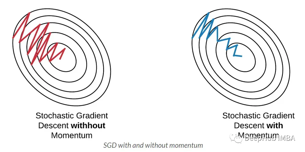 比传统的梯度下降方法更快。动量通过用指数加权平均去噪梯度来解决这个噪声问题,加快了在正确方向上的收敛,减缓了在错误方向上的波动。这个动量超参数用符号“γ”表示。
