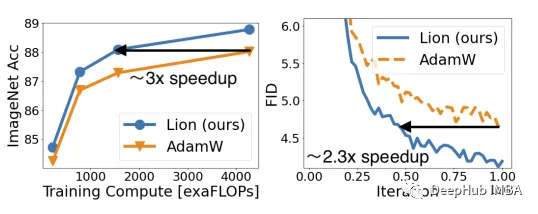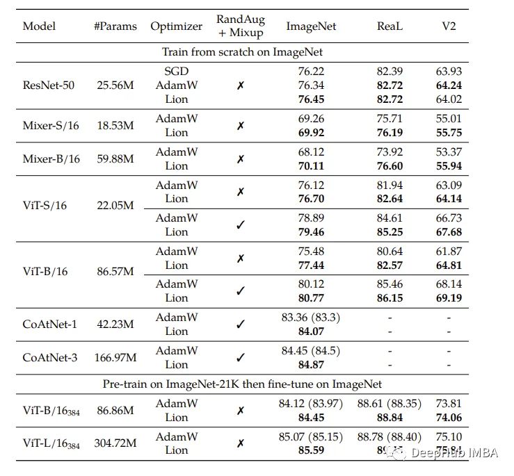 所以这里我们不介绍Lion的具体算法,因为作者说了数千 TPU 小时的算力搜索 这个我们没法评判,这里只介绍一些性能的对比。