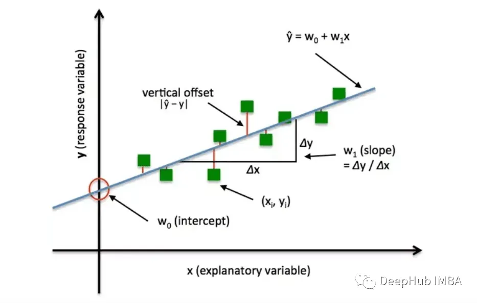 实际的Y值由上面例子中的绿色点表示,拟合的直线由蓝色线表示(由我们的模型预测的值)。