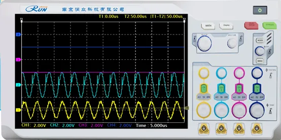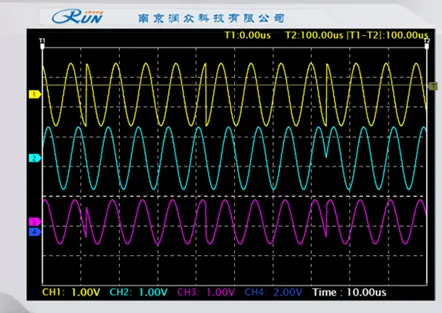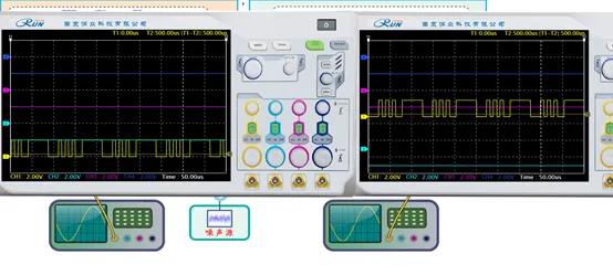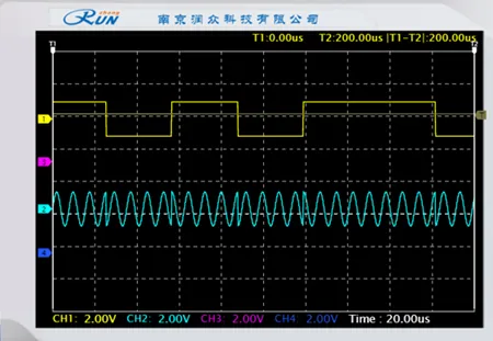 设置基带数据为全“0”,用示波器通道 1 观测调制载波 5TP1,作为同步通道;通道 2 观测载波输出 5VT11;改变调制端载波频率,观测解调端 5VT11 的频率变化;