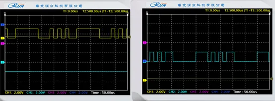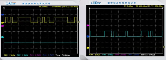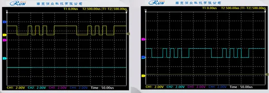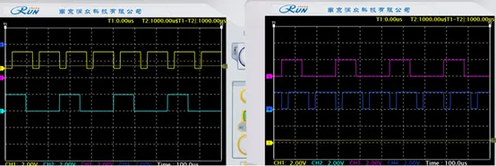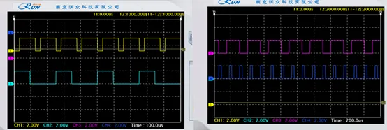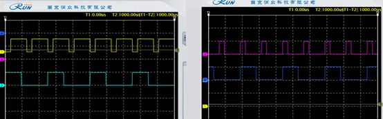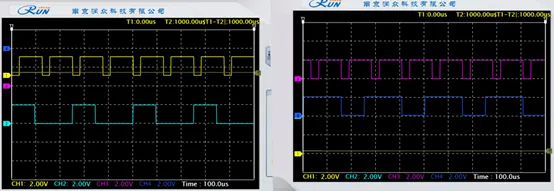 使用示波器观测差分编码后信号:4VT11 和 4VT12,和差分前信号(4TP5 和 4TP6)对比,可见差分编码输出正确。