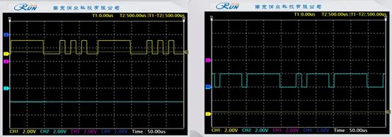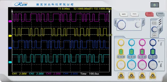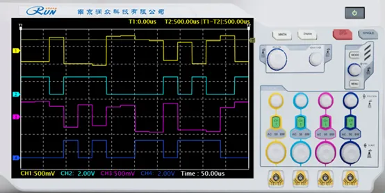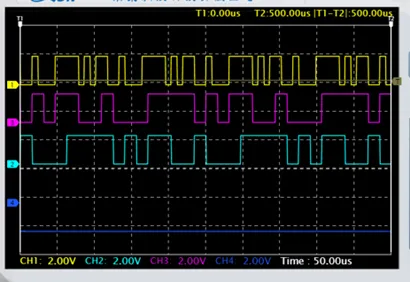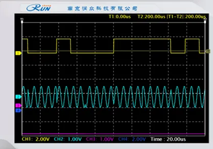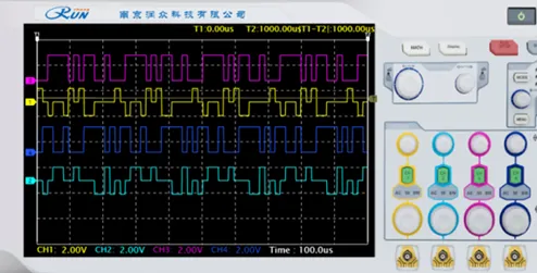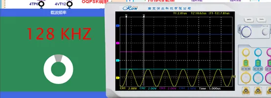 实验结果如上图所示,其中通道一:I符号 通道二:Q符号 通道三:I数据 通道四:Q数据。