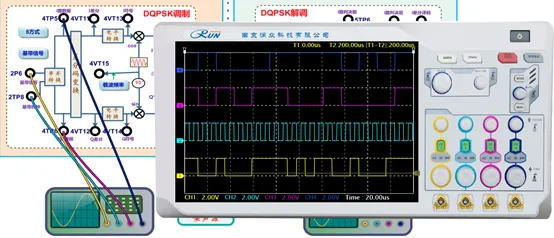 用示波器分别观测串并转换后的 I 路基带数据 4TP6 和 Q 路基带数据4TP5,和2P6 基带数据进行对比,分析其对应关系及速率变化情况。同时观测 4TP5和4TP6,观测其在时间上是否对齐。