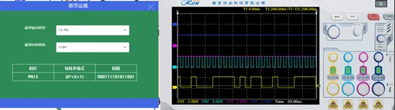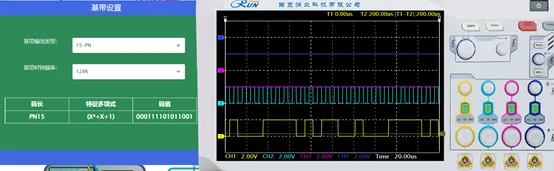 使用示波器分别观察 2P6 和 2TP8,使用鼠标点击“基带设置”按钮,设置基带速率为 “15-PN”“128K”,点击“设置”进行修改。观测基带数据的变化,理解并掌握基带数据设置的基本方法。