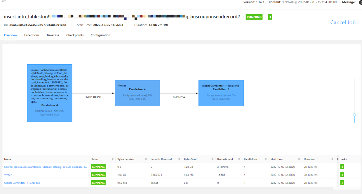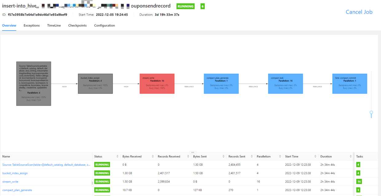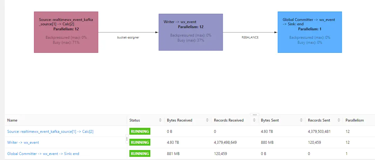 写入性能和资源消耗方面,相同的表(均开启异步 Compact)基于 Apache Paimon 的资源使用情况如下: