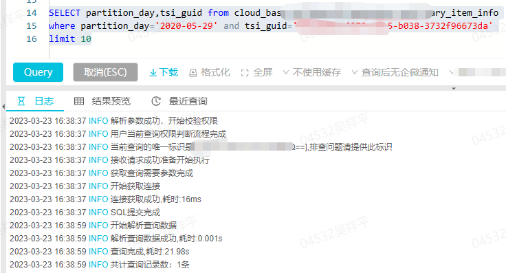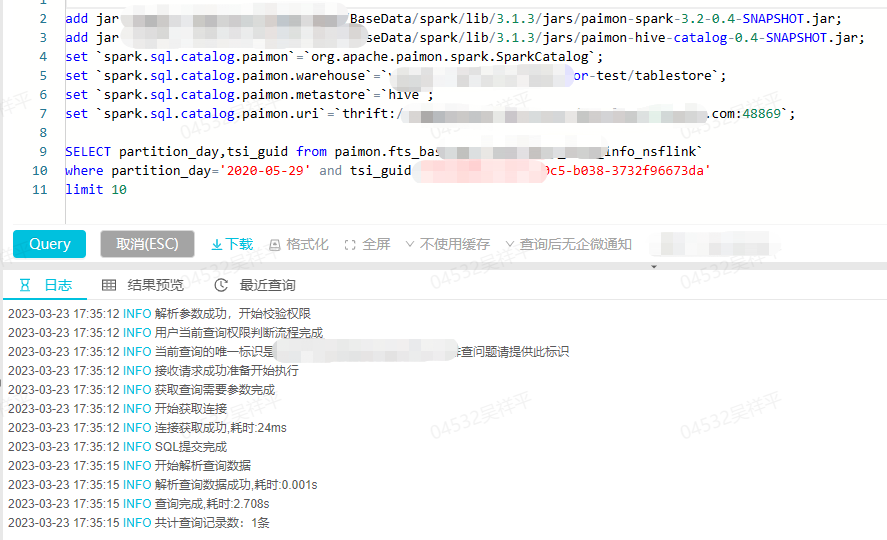我们主要利用基于表主键的 bucket 索引,因为湖仓做到了近实时,所以带来了更多的点查场景,Hudi 利用分区和主键下推到查询引擎后能够剪枝掉大量的分区和文件,不过单 bucket 内仍然需要 scan 整个文件来定位到具体的主键数据,点查性能略显吃力,结合 MOR 查询时的合并流程(如写入流程所描述)点查性能很难提升,以下是基于Hudi的点查,耗时21s。