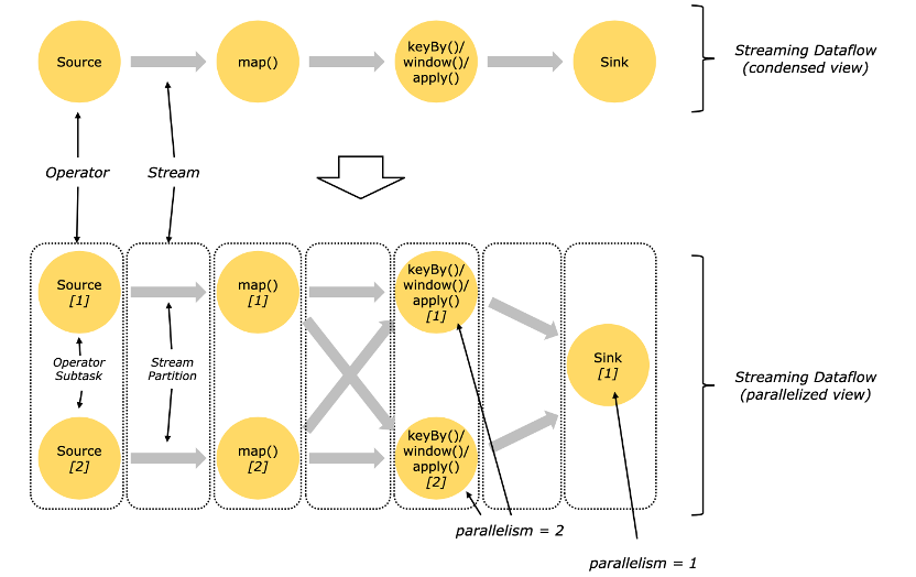 在 Flink 中,应用程序由用户自定义算子转换而来的流式 dataflows 所组成。这些流式 dataflows 形成了有向图,以一个或多个源(source)开始,并以一个或多个汇(sink)结束,如下图所示。