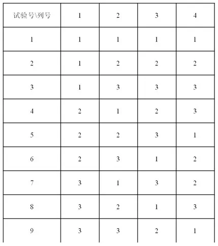 1)每列中不同数字出现的次数相等。这一特点表明每个因素的每个水平与其它因素的每个水平参与试验的几率是完全相同的,从而保证了在各个水平中最大限度地排除了其它因素水平的干扰,能有效地比较试验结果并找出最优的试验条件。