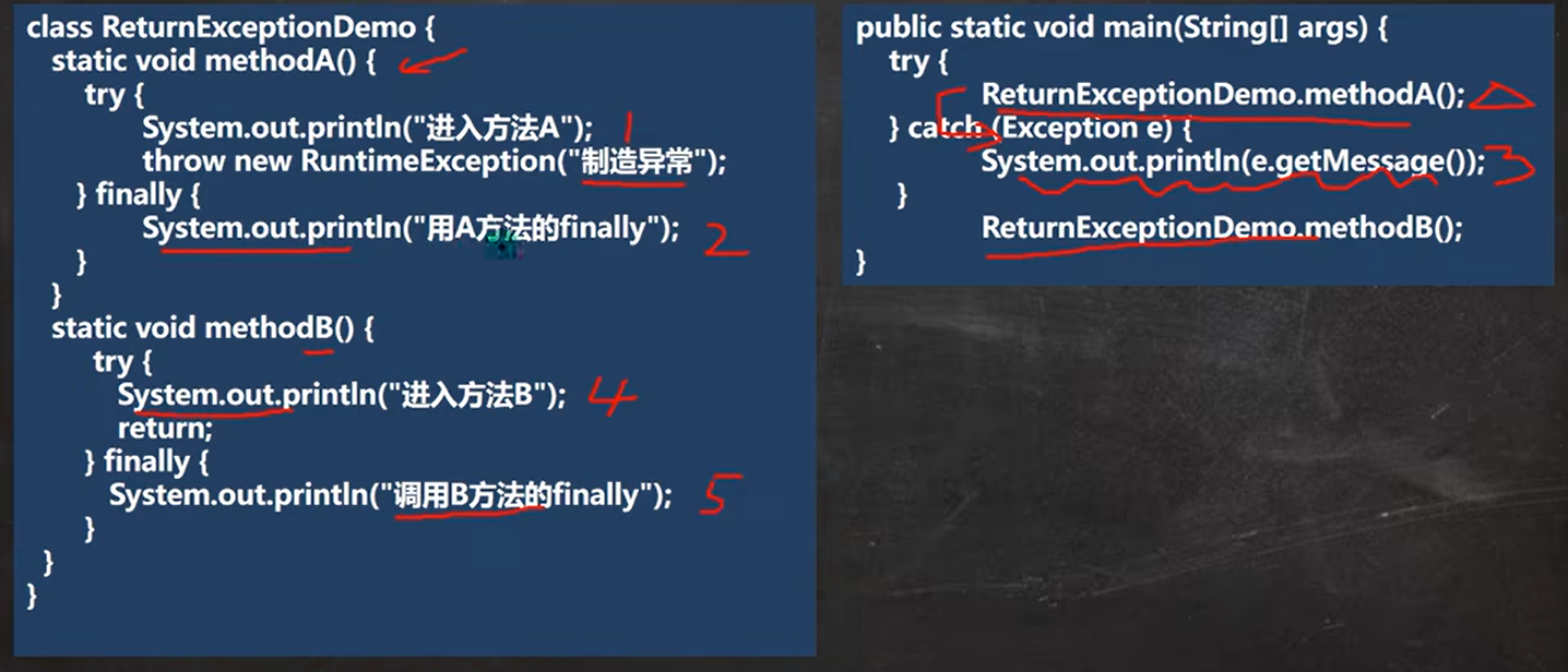 2) 如果出现异常,则try块中异常发生后,try块剩下的语句不再执行。将执行catch块中的语句,如果有finally,最后还需要执行finally里面的语句。