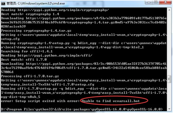 Python安装包时,提示Unable to find vcvarsall.bat,如下