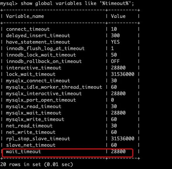 通过show global variables like '%timeout%'可进行查看, 缺省情况下是使用wait_timeout 这个字段。